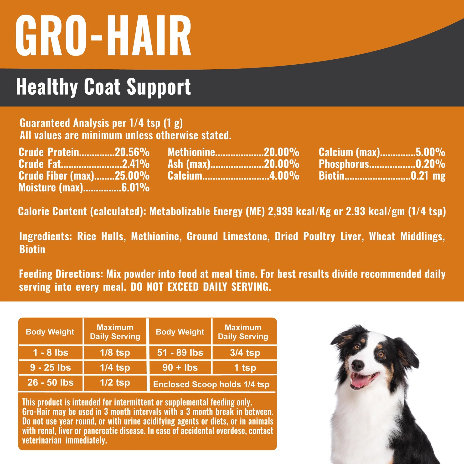 Gro-Hair can be used up to 3 months with a 3 month break between usage. Do NOT use as a daily supplement year round or with urine acidifying agents or diets, or in animals with renal, liver or pancreatic disease. In case of accidental overdose, contact your veterinarian immediately.