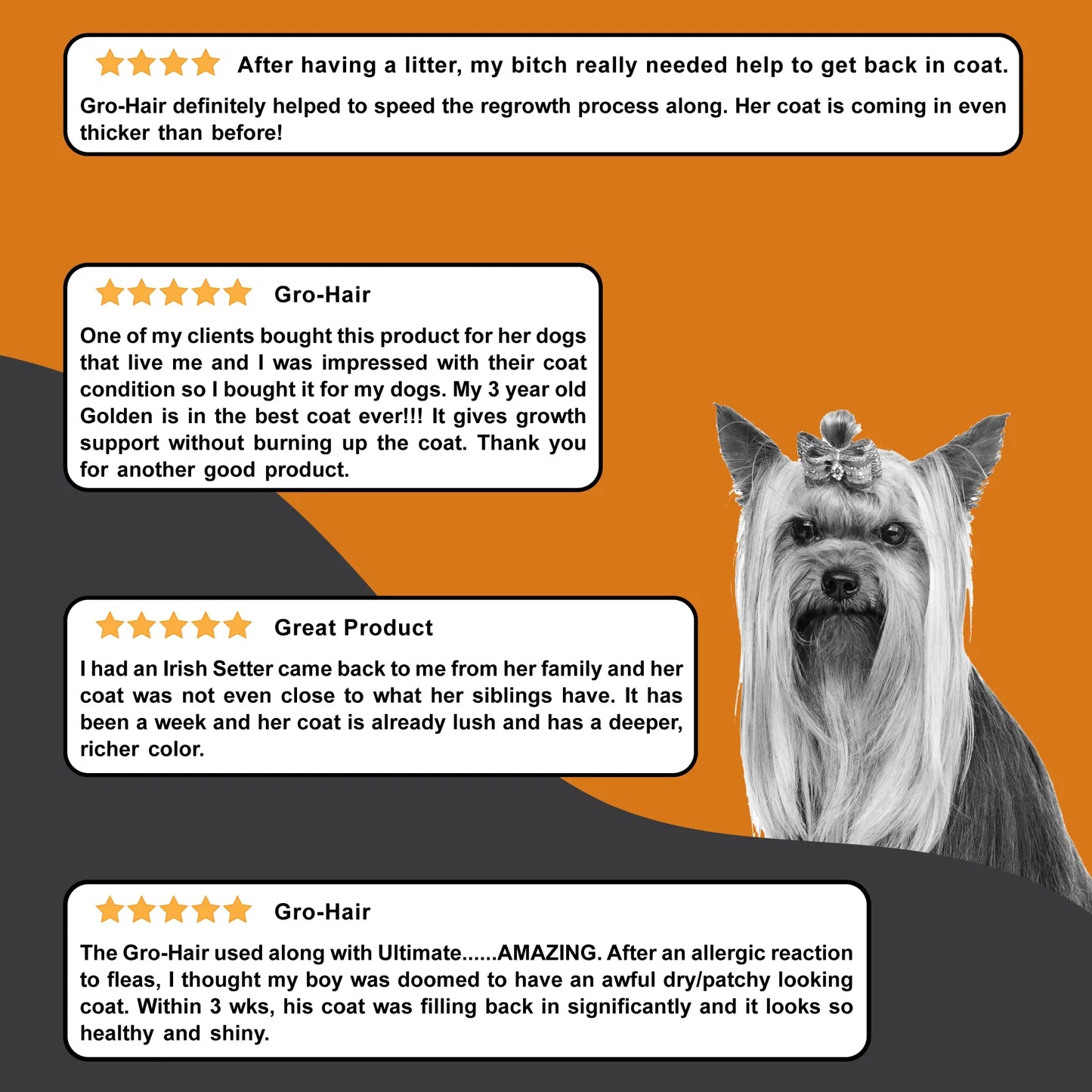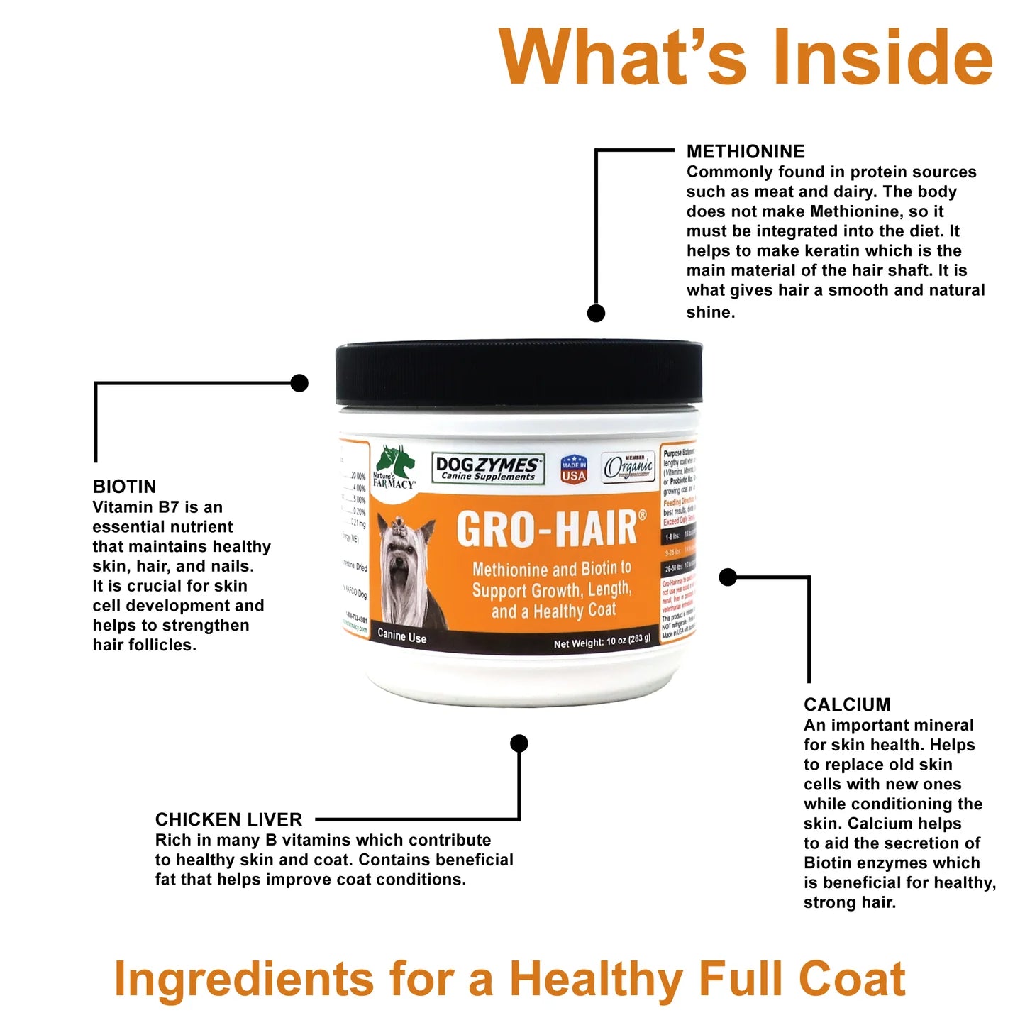 DogZymes Gro-Hair® is formulated to be fed in conjunction with DogZymes Ultimate. DogZymes Gro-Hair cotains Methionine, Biotin, and dehydrated liver meal. Gro-Hair supports a healthy, lengthy coat when used with a quality vitamin mix such as our Dogzymes Ultimate. Use both DogZymes Gro-Hair and DogZymes Ultimate together for best results.