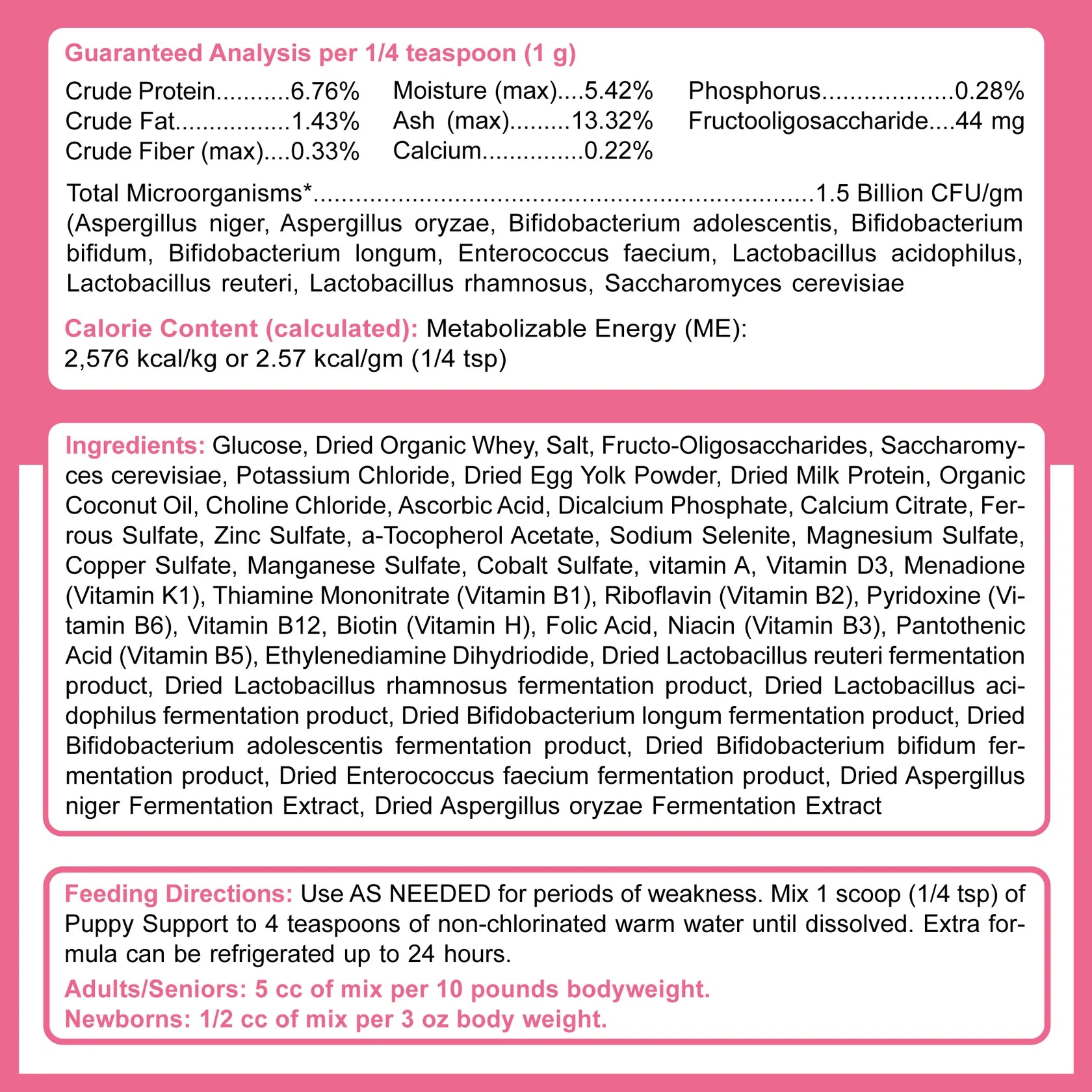 Feeding Directions: Use AS NEEDED for periods of weakness. Mix 1/4 teaspoon (enclosed) of Puppy Support to 4 teaspoons of Non-Chlorinated Water. Add mixture in syringe and feed directly. Extra formula can be refrigerated up to 24 hours.