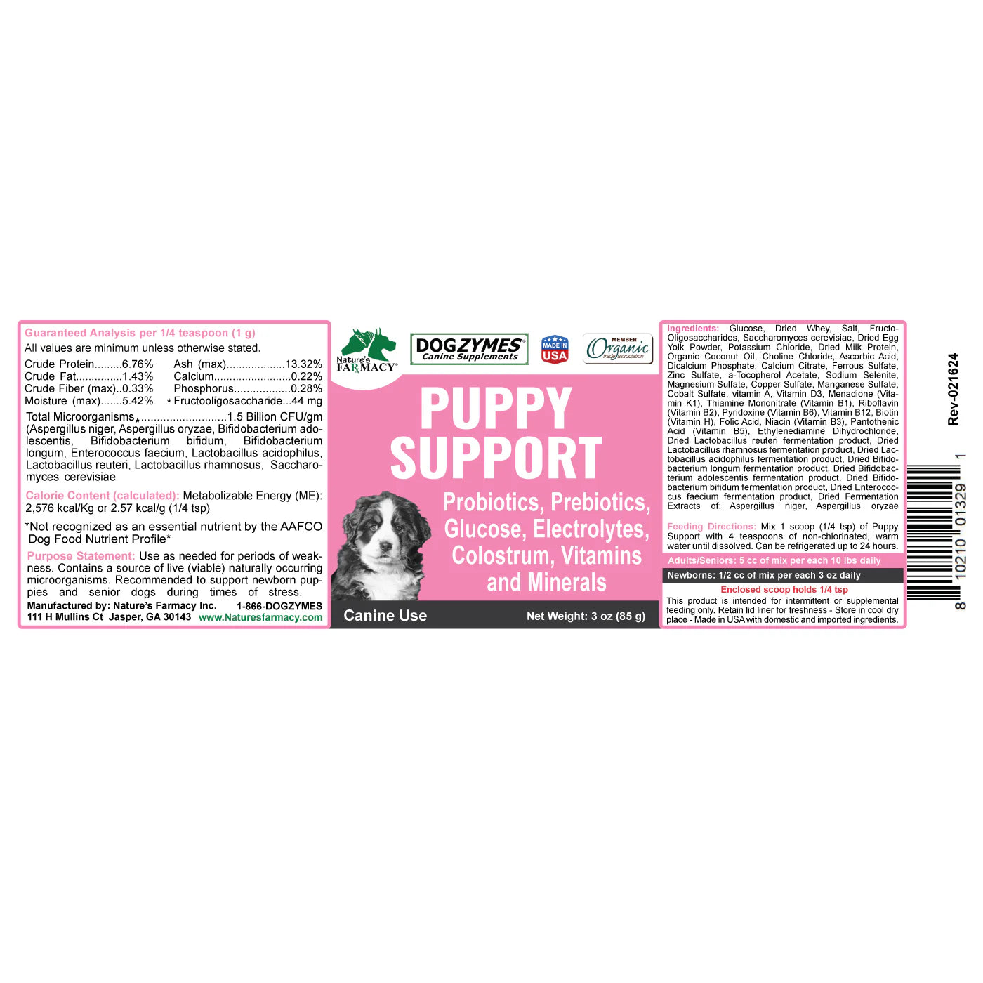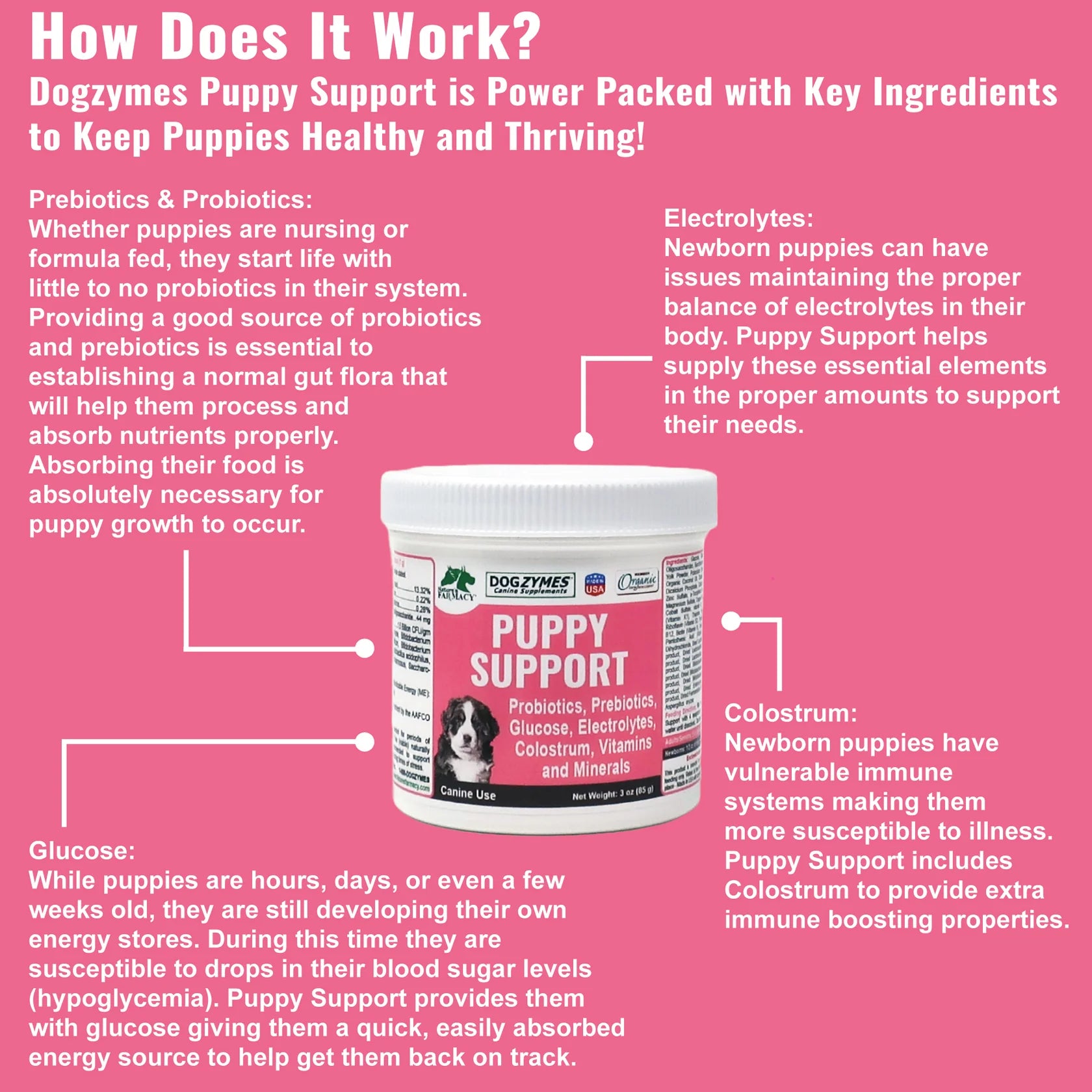 Dogzymes Fading Puppy Support (3 Ounce Powder) is a blend that contains Prebiotics, Probiotics, Enzymes, Colostrum, Glucose, Electrolytes, Vitamins and Minerals to support newborn puppies, puppies, adults and senior dogs during weakness and compromised times of stress. All in one concentrated powder. Mix 1:16 with water. Feed 1/2 cc per 3 ounces of body weight for newborns and 5 cc of mix per 10 pounds of body weight for adults. May be fed 2-4 times daily.